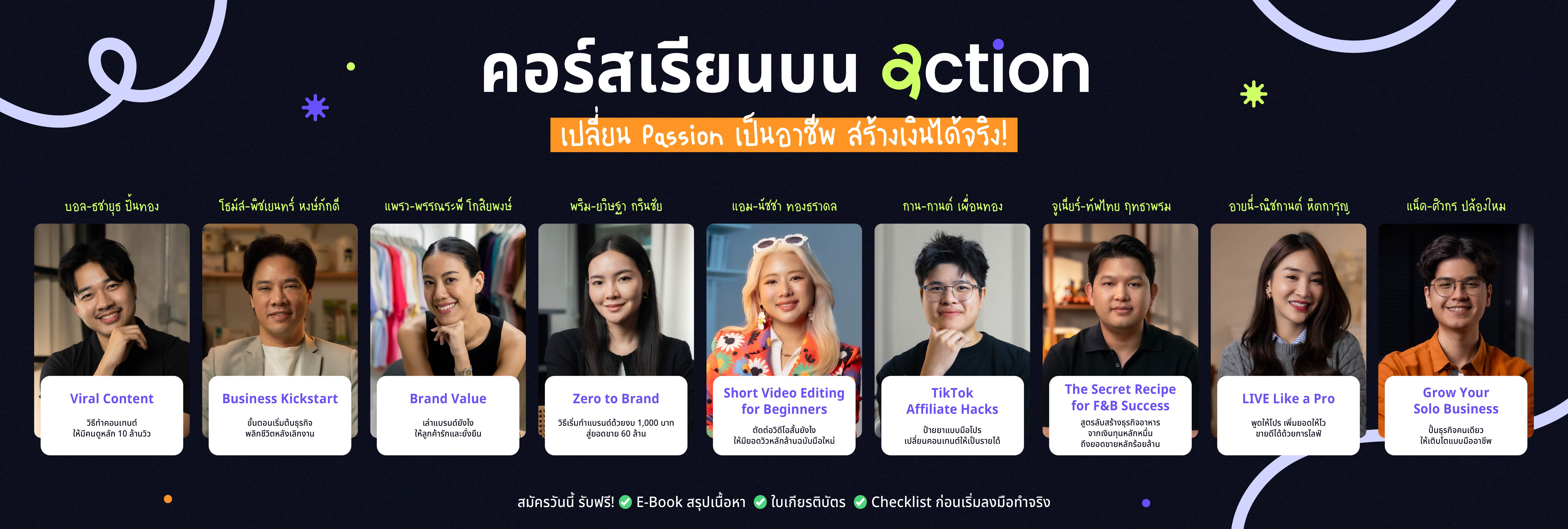 Action (แอ็กชัน) คือ แพลตฟอร์มคอร์สออนไลน์ ที่ช่วยเชื่อมโยงผู้เรียนกับผู้ประกอบการที่ประสบความสำเร็จ ด้วยการถ่ายทอดความรู้ผ่านวิธีการที่พิสูจน์แล้ว และประสบการณ์ตรง เราจึงเปลี่ยนความรู้ให้กลายเป็นเครื่องมือที่ใช้ได้จริง เพื่อให้ผู้เรียนสามารถนำไปปรับใช้ได้อย่างมีประสิทธิภาพสูงสุด